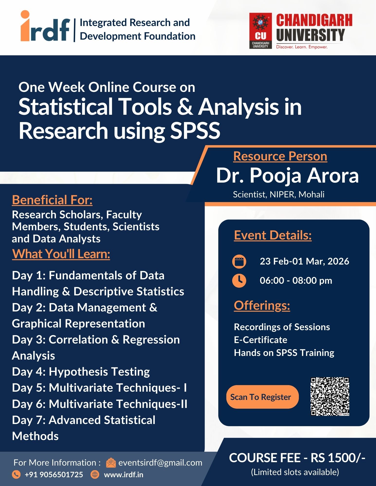 Integrated Research and Development Foundation (IRDF), in collaboration with Chandigarh University, Mohali, is organizing a One Week Online Course on Statistical Tools & Analysis in Research using SPSS from 23 February to 01 March 2026, 6:00 PM – 8:00 PM.